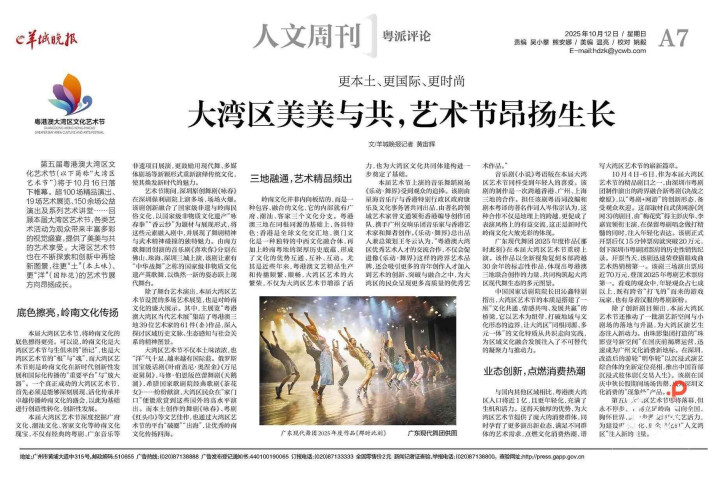 第五届大湾区艺术节即将落幕,但永不停步。它将立足岭南,面向全国,胸怀世界,进一步激发湾区文艺活力,为建设更本土化、更全球化的“人文湾区”注入新的能量。